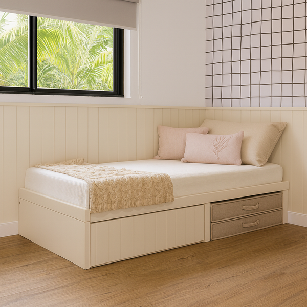 A cama com auxiliar permite uma grande otimização do seu investimento e espaço, acomodando dois lugares de dormir no espaço de apenas um, além de gaveta par armazenamento.