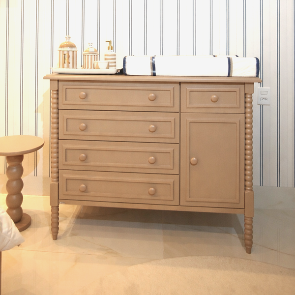 A Cômoda Dot é uma peça de luxo que transforma o quarto do bebê em um ambiente sofisticado e acolhedor. Seus mastros torneados são o grande charme da peça — um detalhe artesanal raro, que adiciona leveza, textura e exclusividade ao mobiliário. Uma cômoda única no mercado, pensado para famílias que valorizam elegância e originalidade.