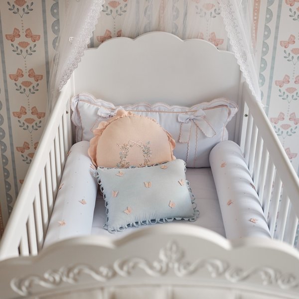 Kit de berço premium, todo em algodão com almofadinhas decorativas em rosê e azul com apliques borboletas.