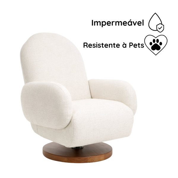 O mecanismo de balanço e giro é um lançamento no mercado nacional. Com uma base redondo em madeira maciça e um mecanismo acoplado que faz a poltrona girar 360º e também balançar!