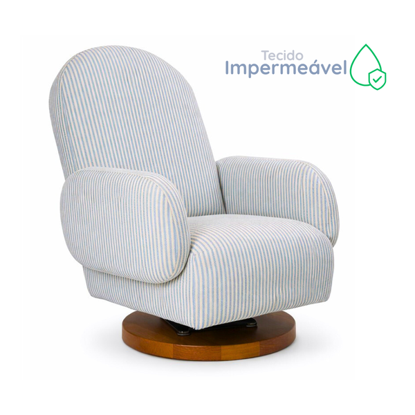 O mecanismo de balanço e giro é um lançamento no mercado nacional. Com uma base redondo em madeira maciça e um mecanismo acoplado que faz a poltrona girar 360º e também balançar!
