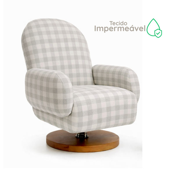 O mecanismo de balanço e giro é um lançamento no mercado nacional. Com uma base redondo em madeira maciça e um mecanismo acoplado que faz a poltrona girar 360º e também balançar!
