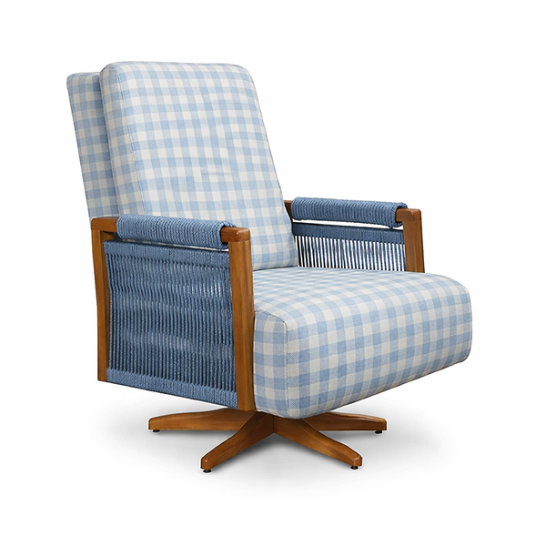 A poltrona é projetada com pés giratórios em madeira maciça, que conferem um toque de elegância e modernidade, além de balançar e girar em 360°.