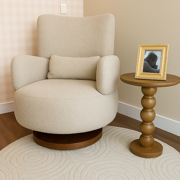 A Poltrona Bambolê conta com mecanismo de giro+balanço com um disco de madeira maciça, trazendo muito mais qualidade e durabilidade para a poltrona, que poderá ser usada em diversos ambientes após a amamentação!